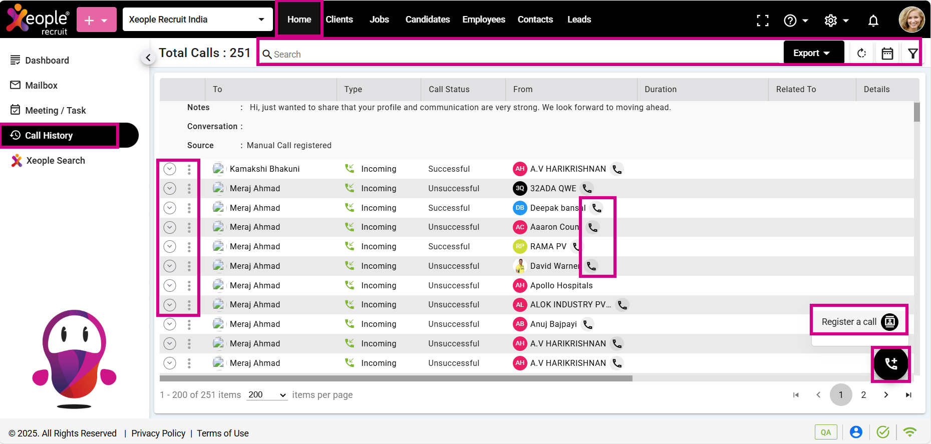 Any call log associated with a candidate, client, contact, or job will be recorded under both the respective profile and the Call History section, reflecting the same entry in both locations.