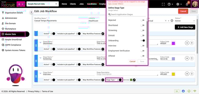 Each Job Workflow Stage must be mapped to a Stage Type, which is mandatory. Only one stage type can be assigned to a workflow stage, and it cannot be reused across stages.
