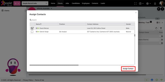 Upon selecting Assign Contacts, you will be presented with a list of all contacts. Choose the desired contacts using the checkboxes provided, then click Assign Contact to proceed.