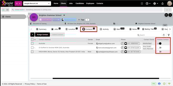 Primary Contact is the main communication point within a client organisation. This individual manages the relationship with the recruitment agency, coordinates recruitment efforts, and addresses any needs or concerns related to the recruitment process. To select the contact as the primary contact, toggle the Primary Contact option under the Contacts section upon assigning contact(s).