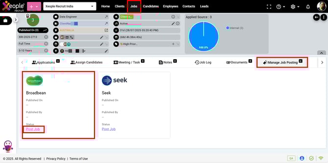 - You have the option to explore different job boards; choose Broadbean to post a job.