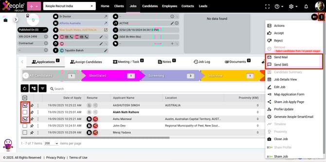 - To bulk contact candidates, select the checkbox in front of each candidate you wish to contact, then click on the three-dot button and choose an option either Send Mail or Send SMS.
