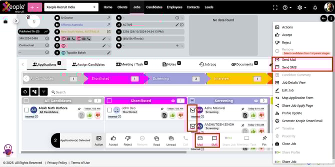 Job Summary Page - List View - Select Candidates - Send Mail or Send SMS