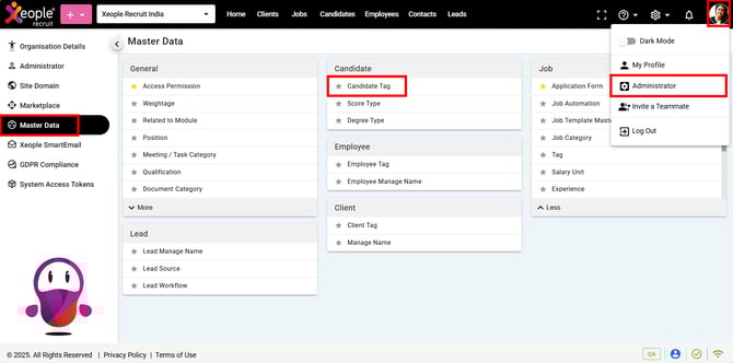 - Click on Master Data from the left navigation panel and select Tag under Candidate.