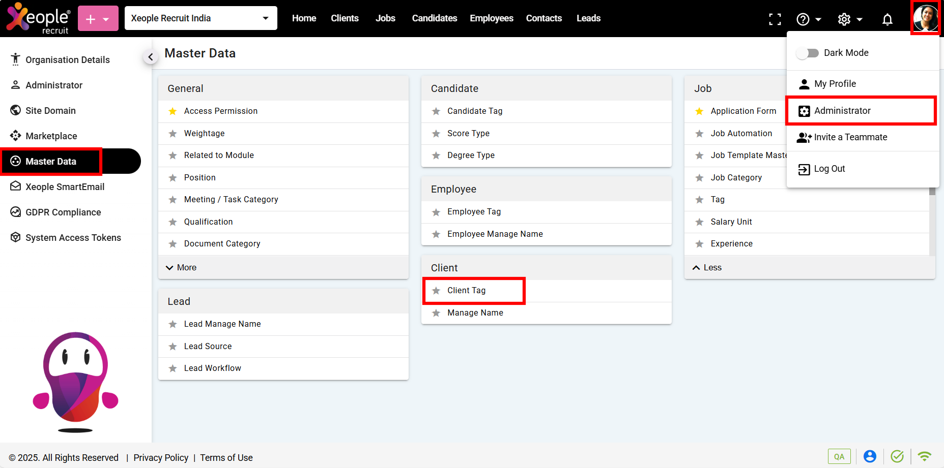 - Click on Master Data from the left navigation panel and select Tag under Client.