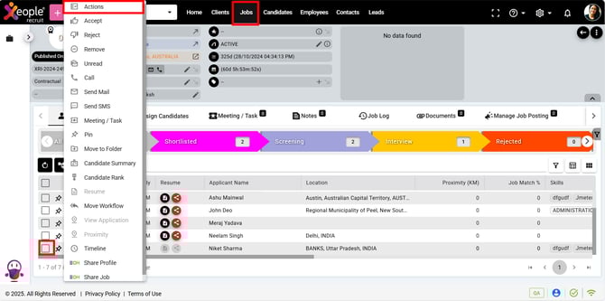 - To view the client vs job document(s), click on the candidate’s name, or check box and select Action in a grid view or click on the three-dot button in front of each candidate and choose Action in a list view.