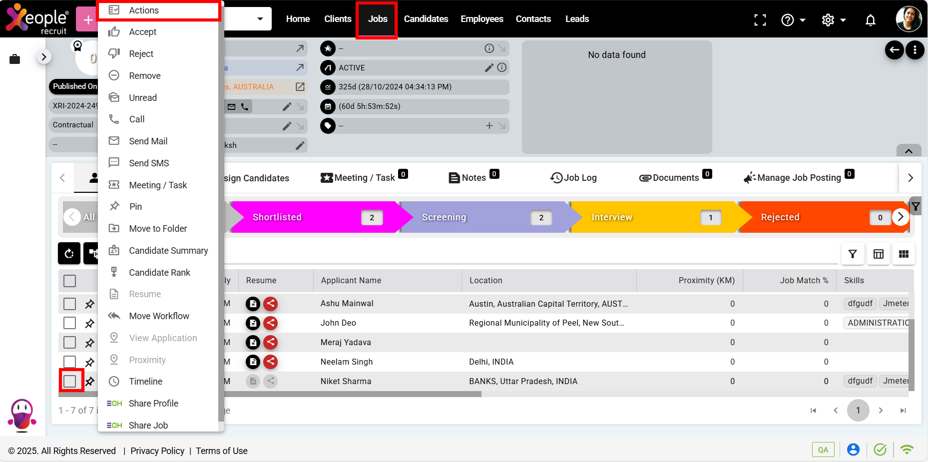 - To view the client vs job notes log(s), click on the candidate’s name, or check box and select Action in a grid view or click on the three-dot button in front of each candidate and choose Action in a list view.