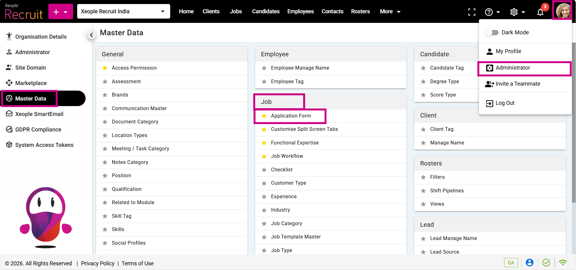 - Click on the Profile picture and select Administrator from the drop-down menu.