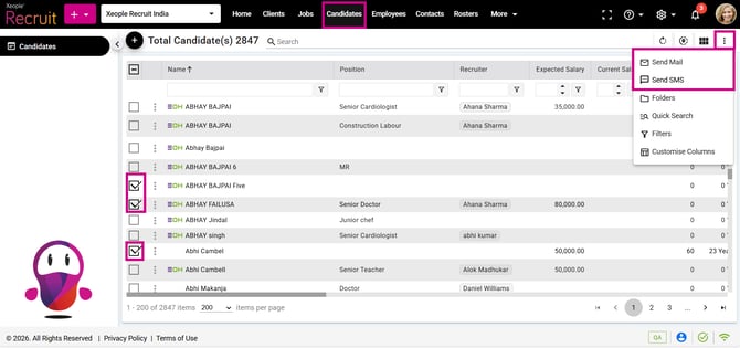 - You will find a list of all candidates. Click on the checkboxes in front of each candidate you wish to send a Mail or SMS.