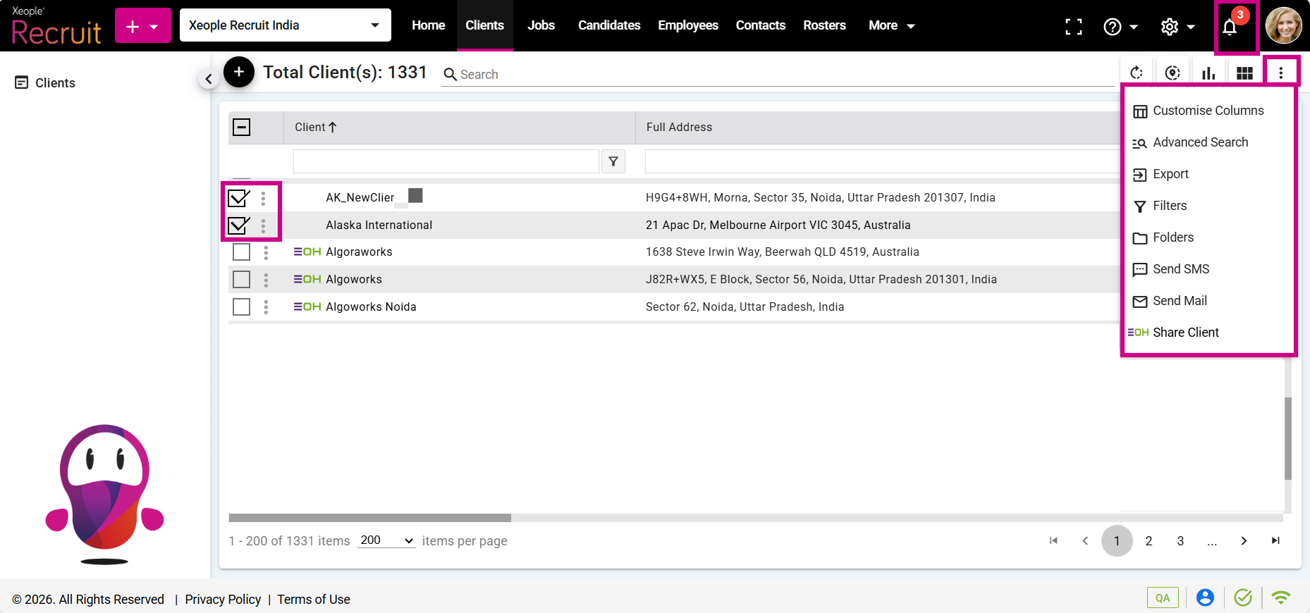 - Access the list of all clients, select client(s) you want to contact by clicking on the checkbox placed next to each client.