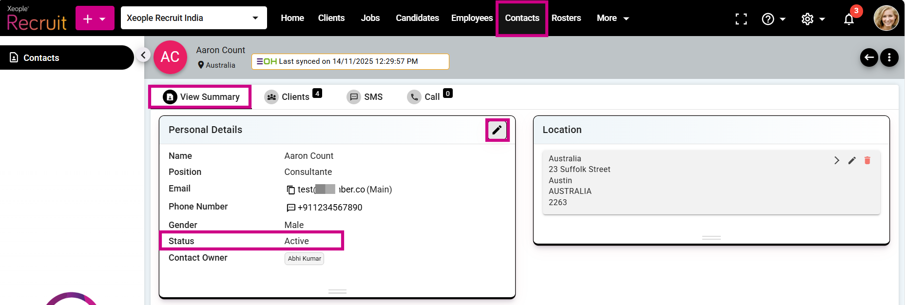 - You can change the contact’s status from the status drop‑down on the contact summary page.