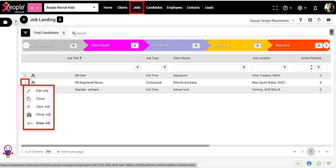 - To edit, clone, view, share or close a Job, click on the three-dot button and select the required option as needed.