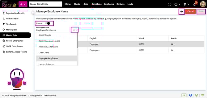 The Manage Employee Name Master feature enables you to dynamically replace the default Employee name (e.g., Employee) with a selected name (e.g., Agent) across the system. This update is reflected across the Employee module header and all associated data, ensuring consistent terminology throughout the system.