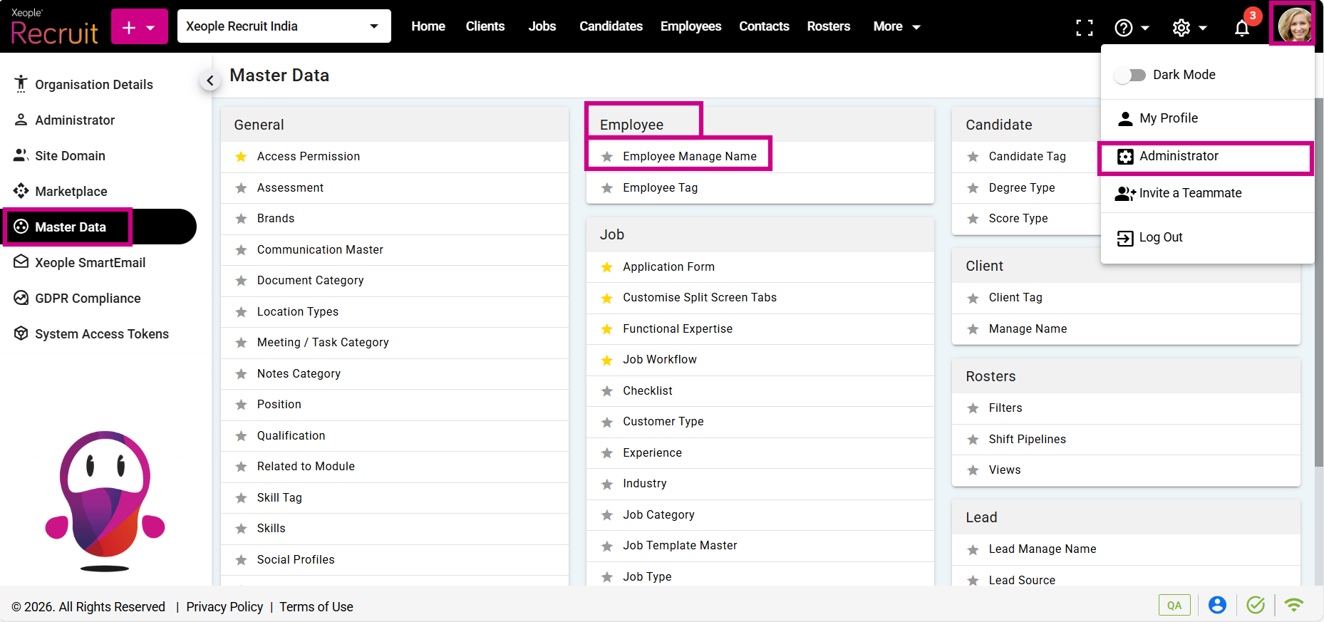 - Click on the Profile picture and select Administrator from the drop-down menu.