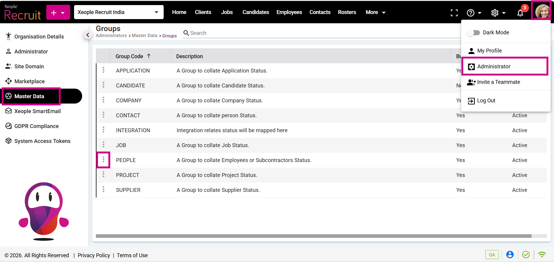 - Click on the Profile picture and select Administrator from the drop-down menu.
