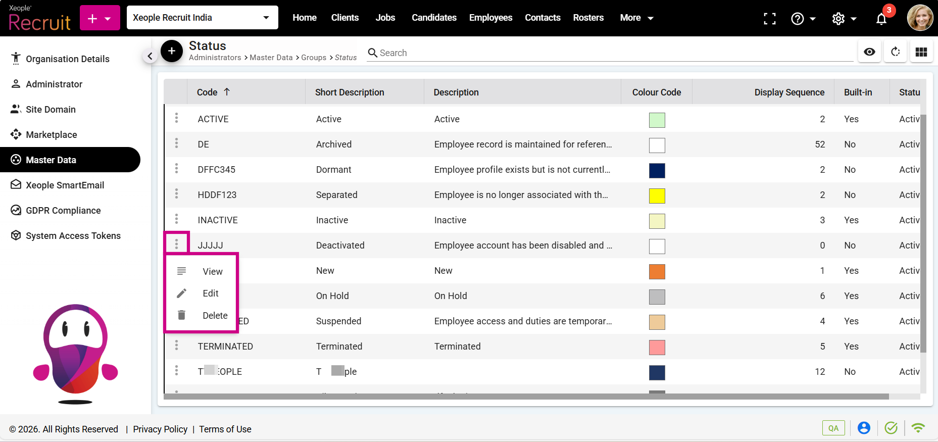 Master Data – Status – View, Edit or Delete