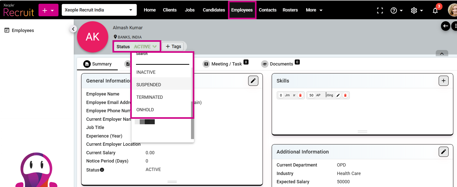 - You can change the employee’s status from the status drop‑down on the employee summary page.