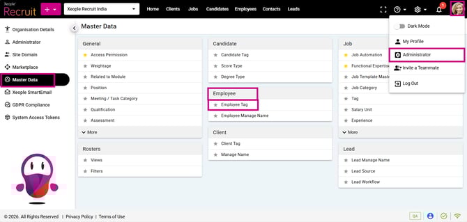 - Click on Master Data from the left navigation panel and select Employee Tag under Employee.