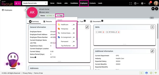 - To assign an employee to a specific tag, navigate to the employee summary page where you can view and toggle on the tags created in the Employee Master. On the employee landing page, you can also use filters to quickly search, and sort employees based on their tags.