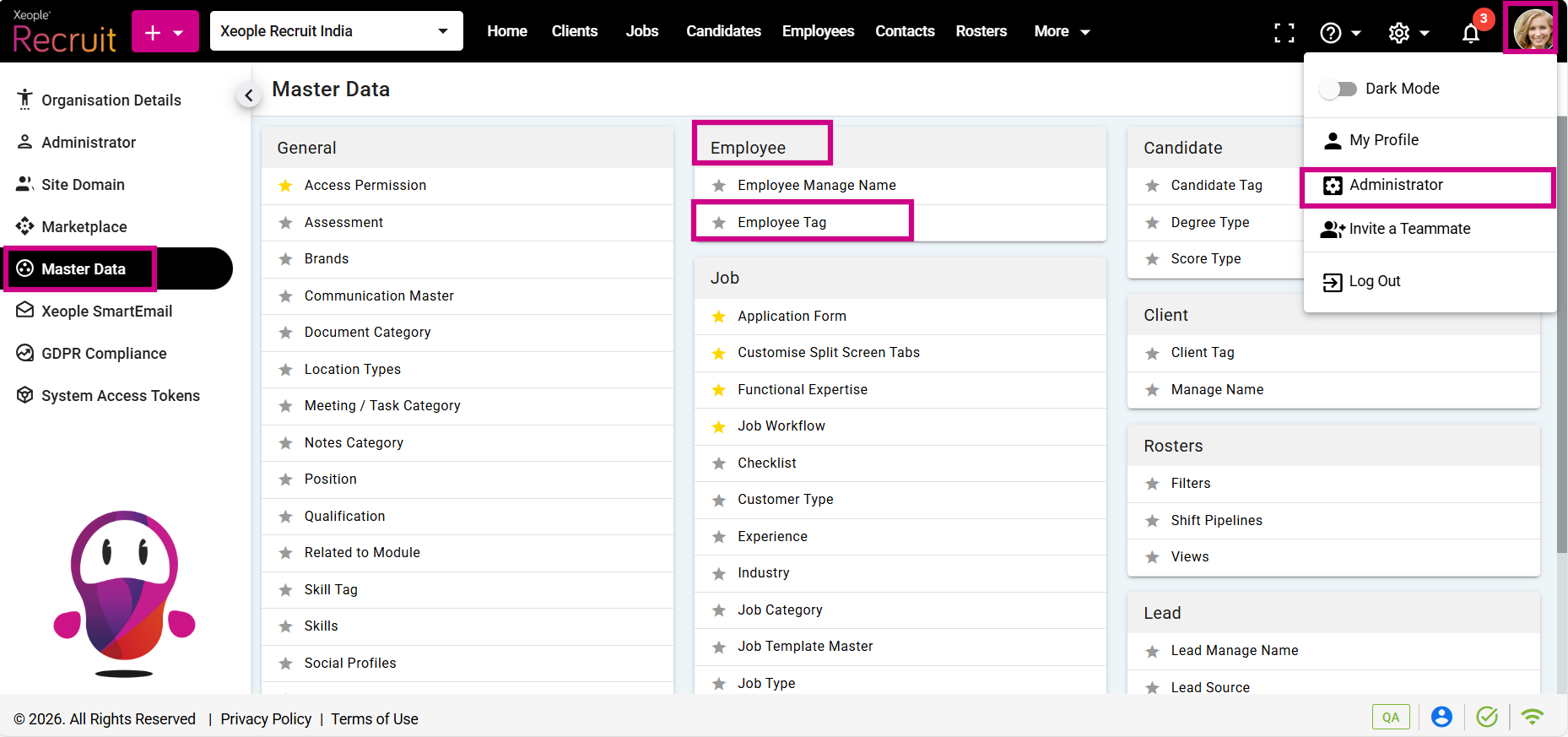 - Click on the Profile picture and select Administrator from the drop-down menu.