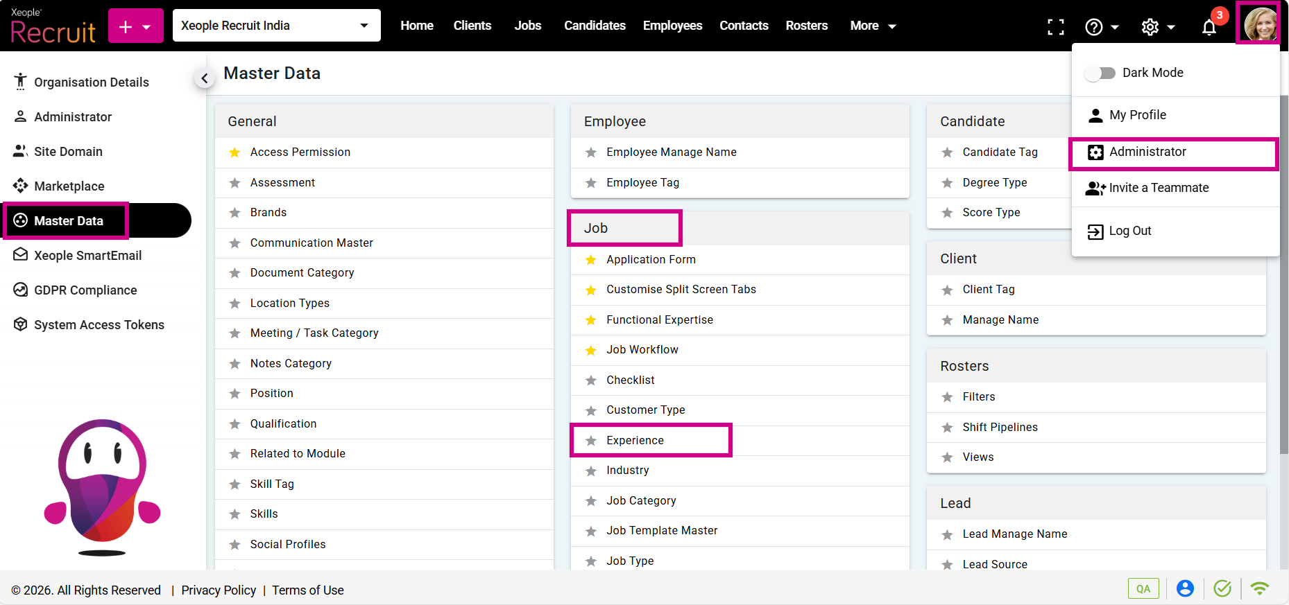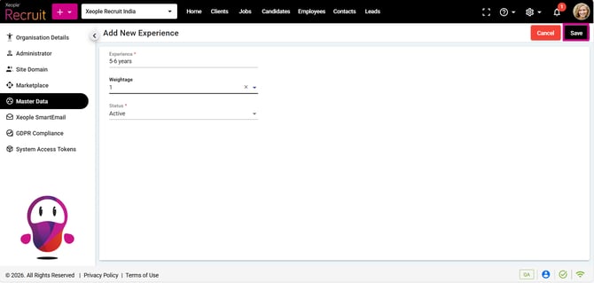 - Click on Master Data from the left navigation panel and select Experience under Job.