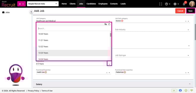- You can select the newly created Experience from the Experience drop-down when creating a job.