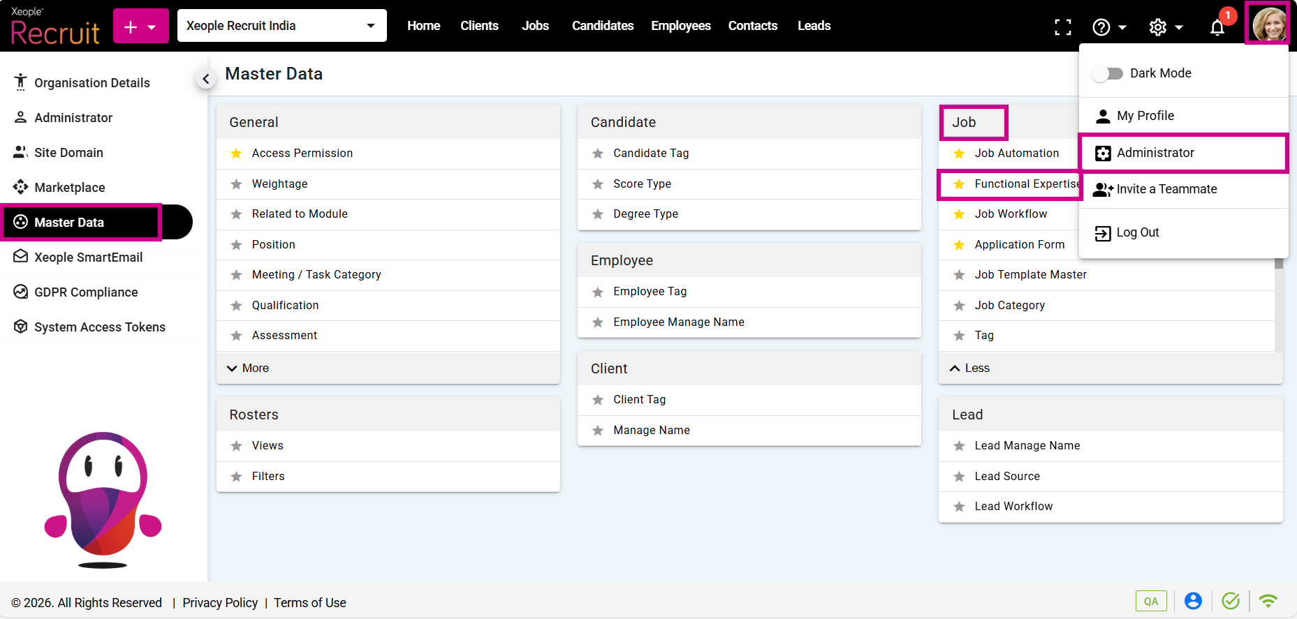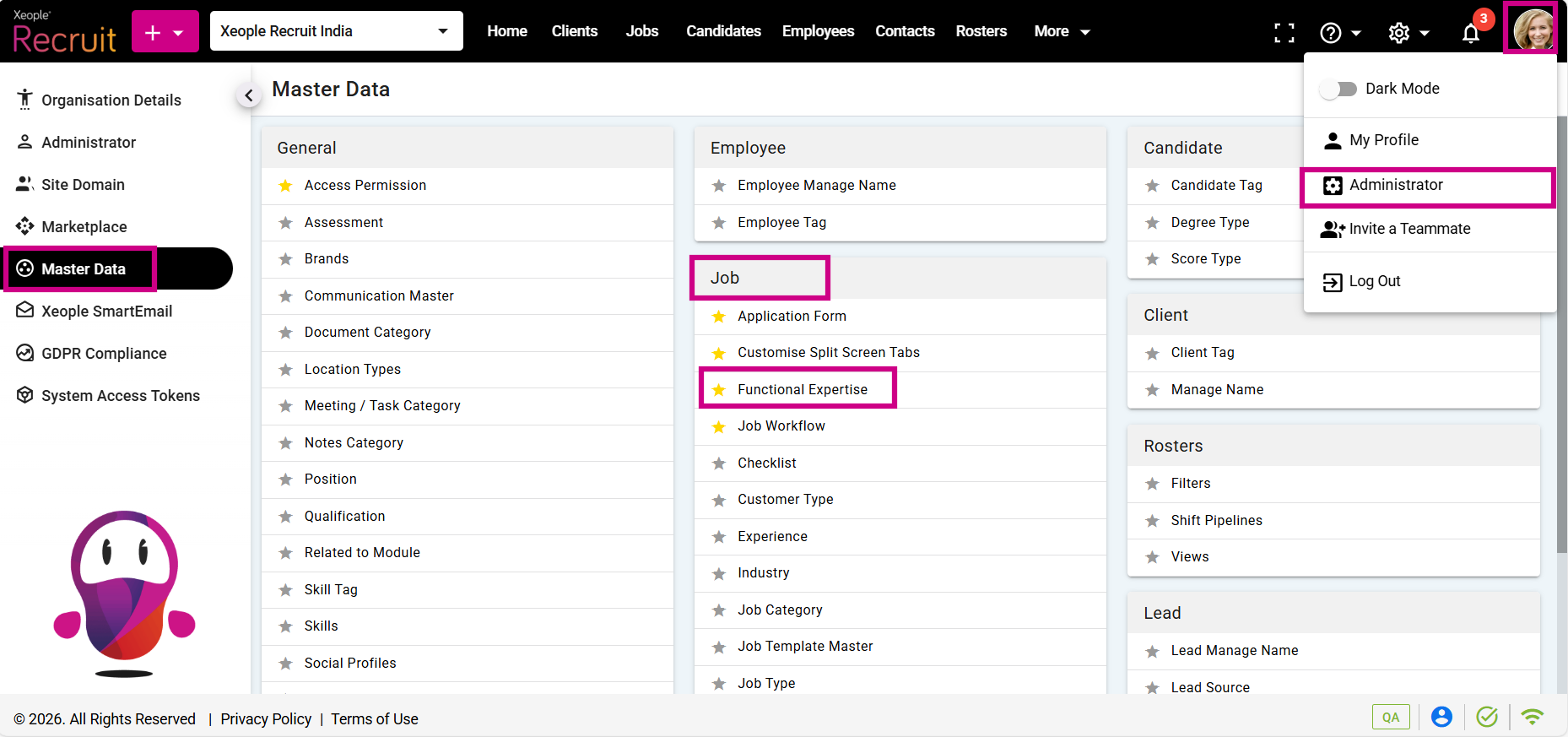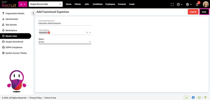 - Click on Master Data from the left navigation panel and select Functional Expertise under Job.