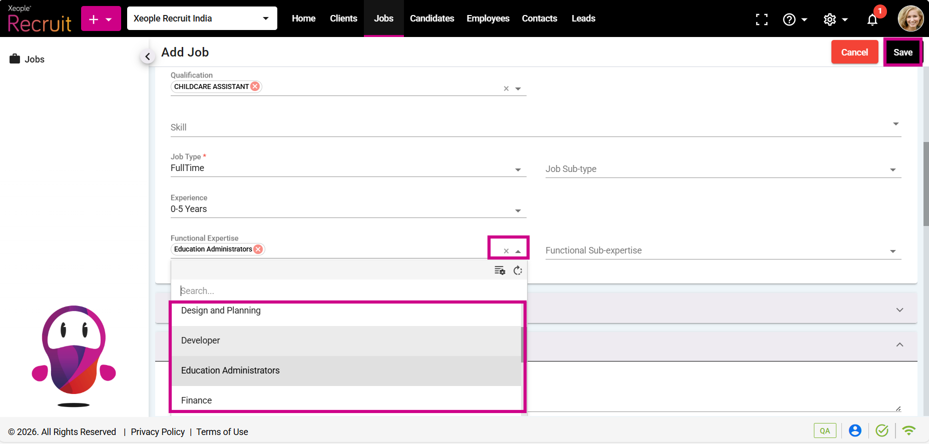 - You can select the newly created Functional Expertise from the Functional Expertise drop-down when creating a job.
