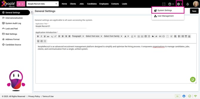 • Step 1. Application/System Settings: Configure and personalise XeopleRecruit to adjust its behavior and appearance to suit your needs.