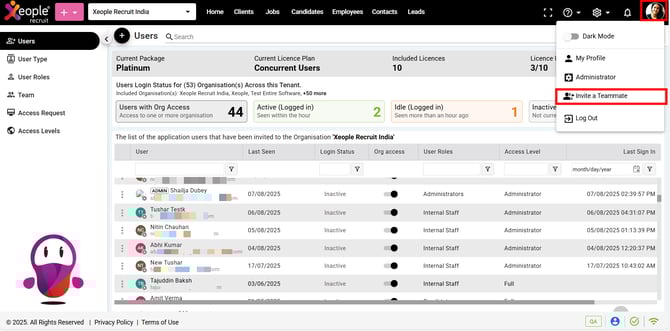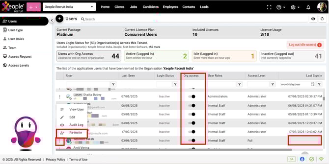 - If no last sign-in activity is logged, you can Re-invite the user via the three-dot button. This feature is accessible only to admins and super admins.