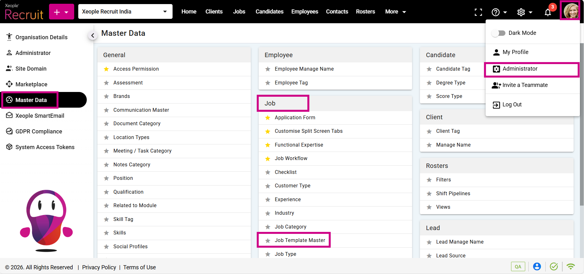 - Click on the Profile picture and select Administrator from the drop-down menu.