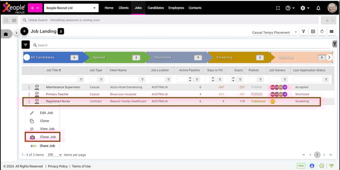 - If you need to close or reopen a job, click Close Job here. Additionally, once a job is closed, you'll have the option to reopen it.
