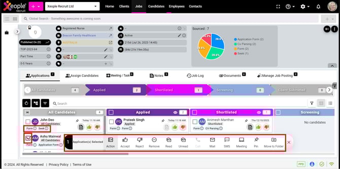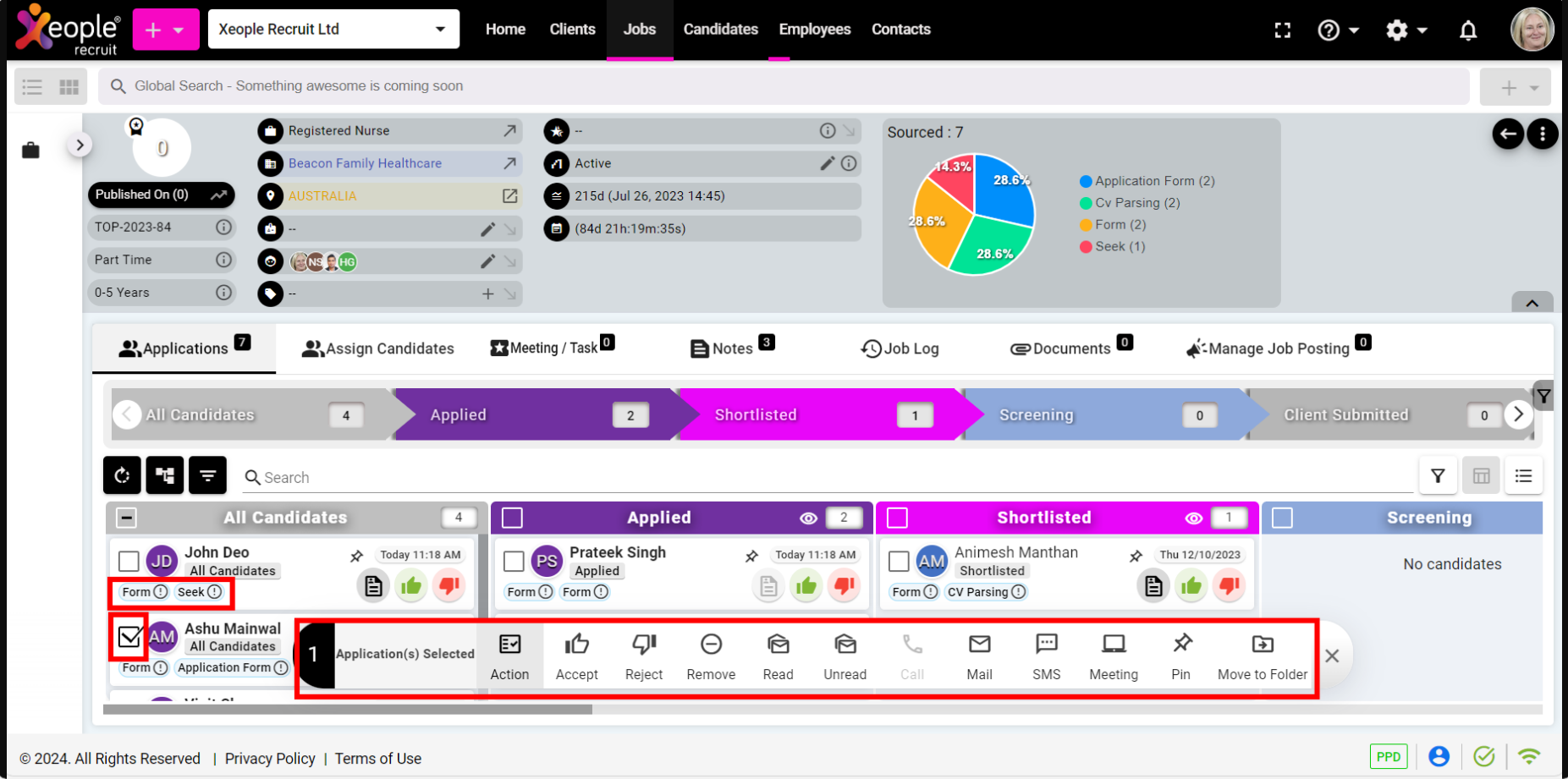 - Once a job is published on the job boards, candidates applying through that job posting will be automatically mapped to the particular job. To check the details or communicate, navigate to the Job summary page, select the candidate, and perform actions such as emailing, SMS, scheduling meetings, etc.