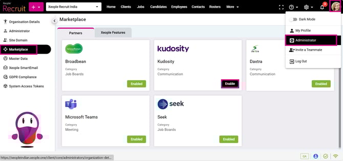 Administrator – Marketplace – Kudosity – Enable