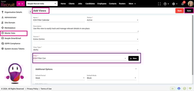 No default; sourced from Masters > Rosters > Filters; includes (+) New to create a filter |