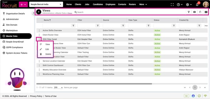This screen shows all View(s) you created or those configured by the admin, based on your permissions. You can edit or delete only the Views you created. Super Admin and Admin can edit or delete any user-created View(s), depending on access. By default, admin-created Views appear if no other Views exist.