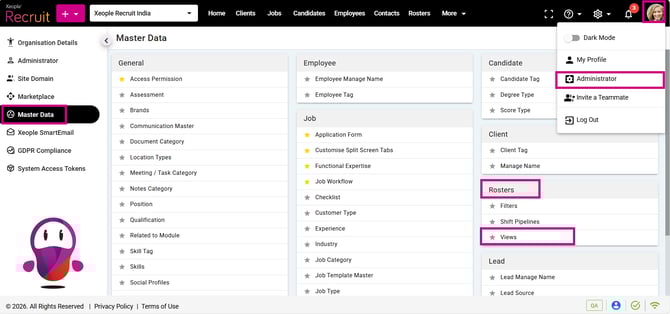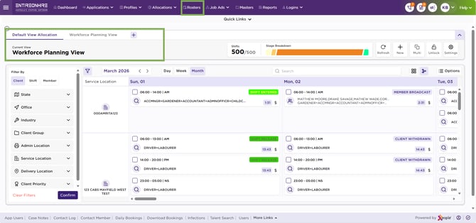 Once you configure the required View(s) in View Master, they automatically appear as selectable tabs in the Calendar Header. From here, you can quickly switch between different views to control which source data is displayed on the calendar. This functionality ensures that schedulers can tailor the calendar display to specific operational needs.