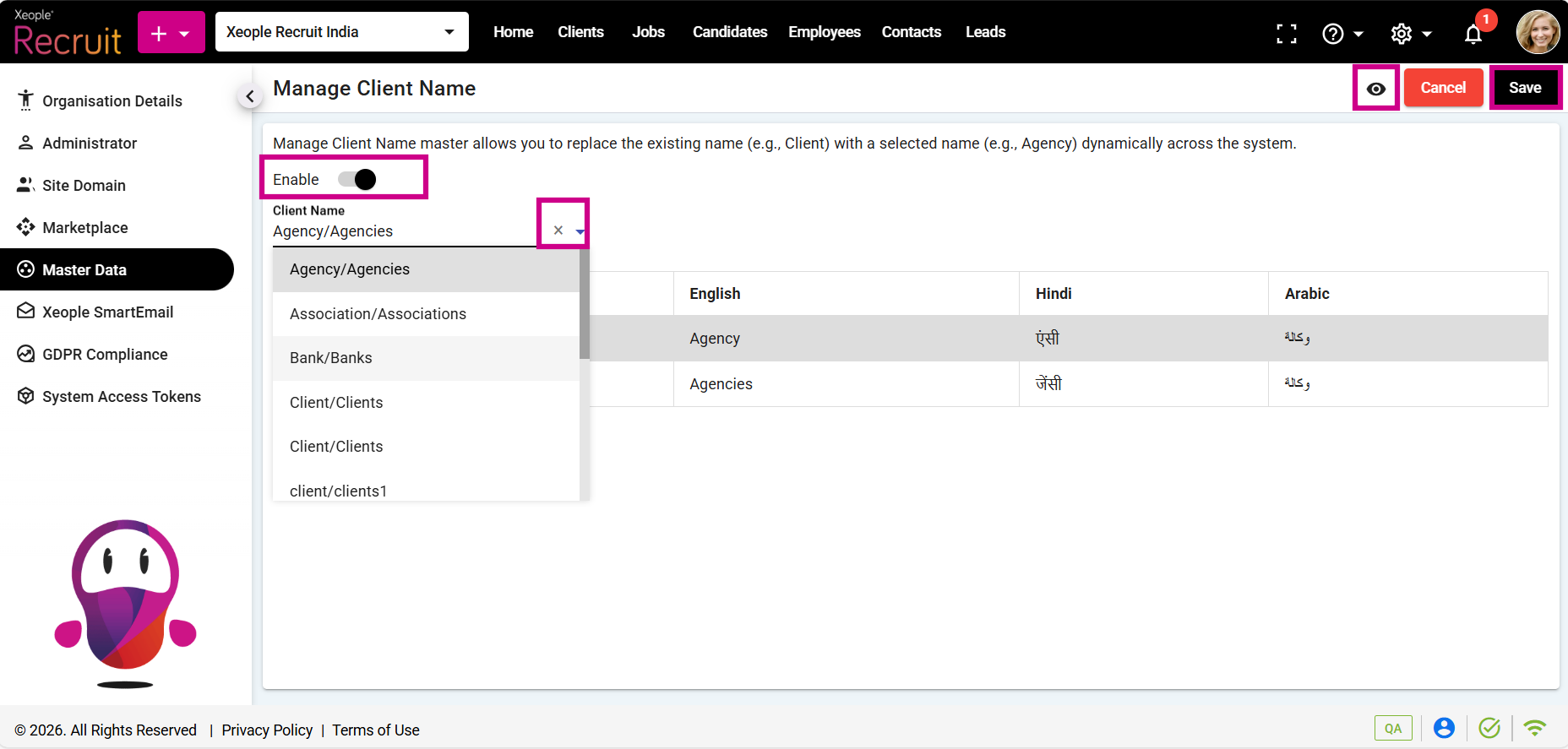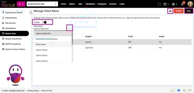Manage Client Name Master feature enables you to dynamically replace the Client name (e.g., Client) with a selected name (e.g., Agency) across the system. This update reflects across the Client module header and all associated data, ensuring consistent terminology throughout the system.