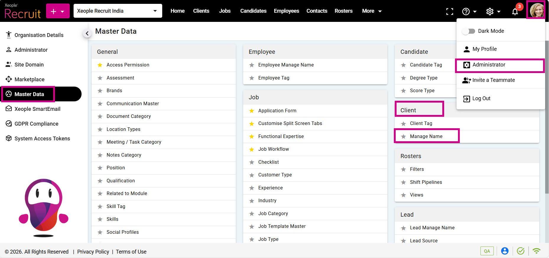 - Click on the Profile picture and select Administrator from the drop-down menu.