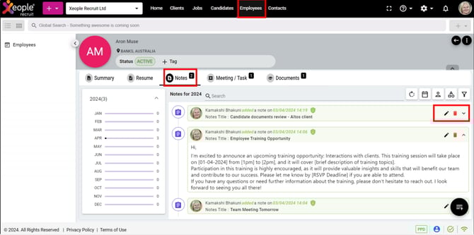 The Notes section on the Employee Summary page serves as a centralised hub for documenting crucial employee-related details. These concise yet comprehensive records capture important information and interactions pertaining to employees within the organisation.