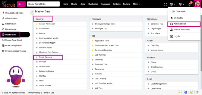 - Click on Master Data from the left navigation panel and select Notes Category under General.