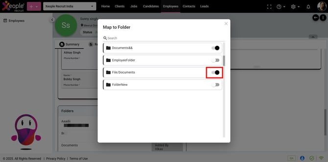- Likewise, you have the option to map an employee to one or multiple folder(s). To remove a mapped folder, click on the (+) button and then toggle off the selection.