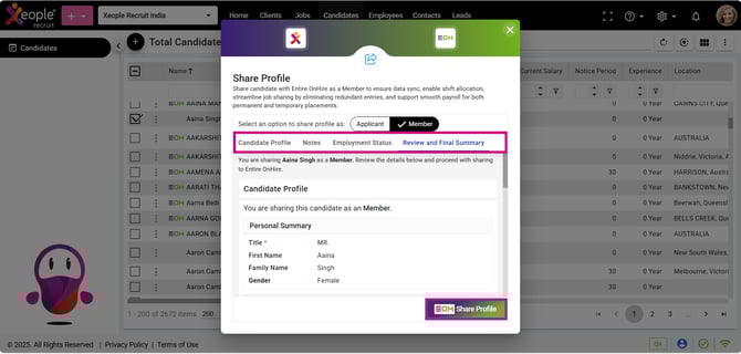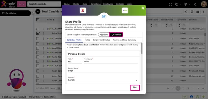 We have introduced multiple methods to push candidate as a member from XeopleRecruit (XR) to Entire OnHire (EOH), facilitating shift allocation—referred to as jobs in XR—and streamlining the payroll process. Upon sharing a member with EOH, the individual receives a notification containing login credentials for the member app, allowing them to view assigned shifts and respond by accepting or rejecting them based on their availability.