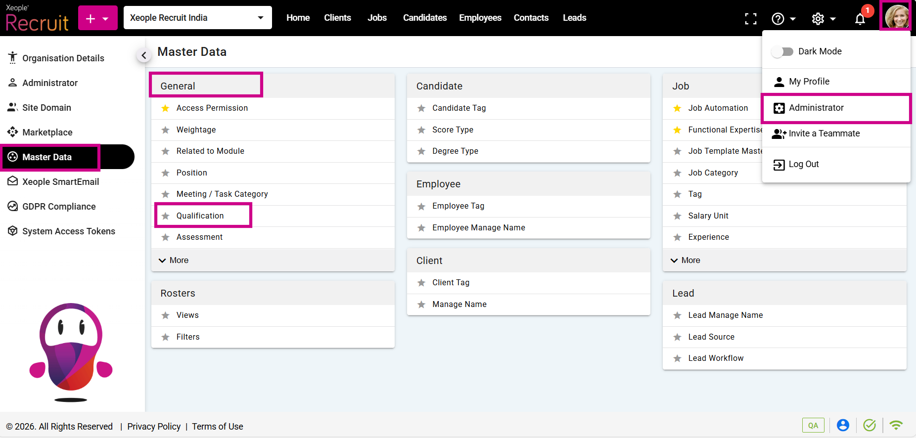 - Click on the Profile picture and select Administrator from the drop-down menu.