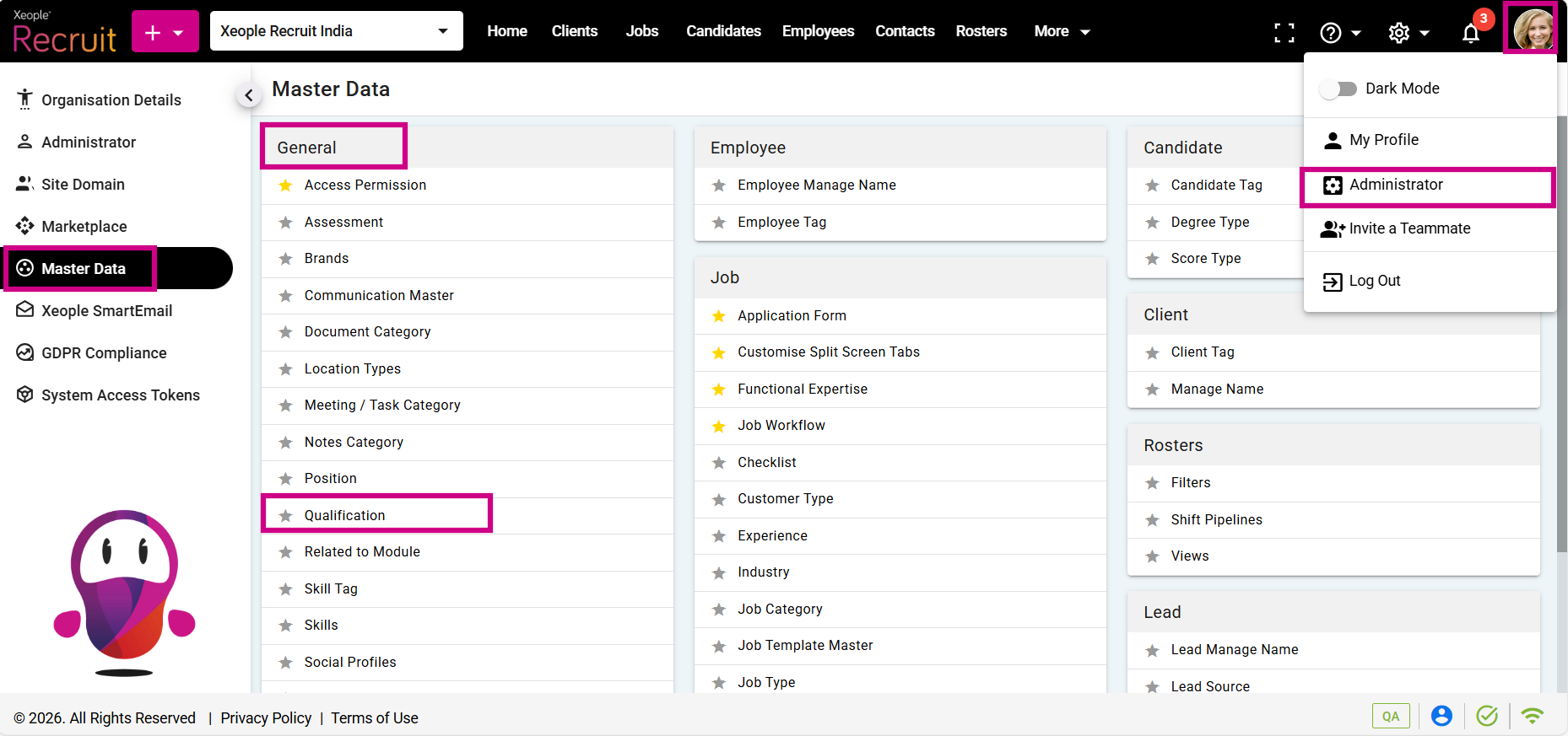 - Click on Master Data from the left navigation panel and select Qualification under General.