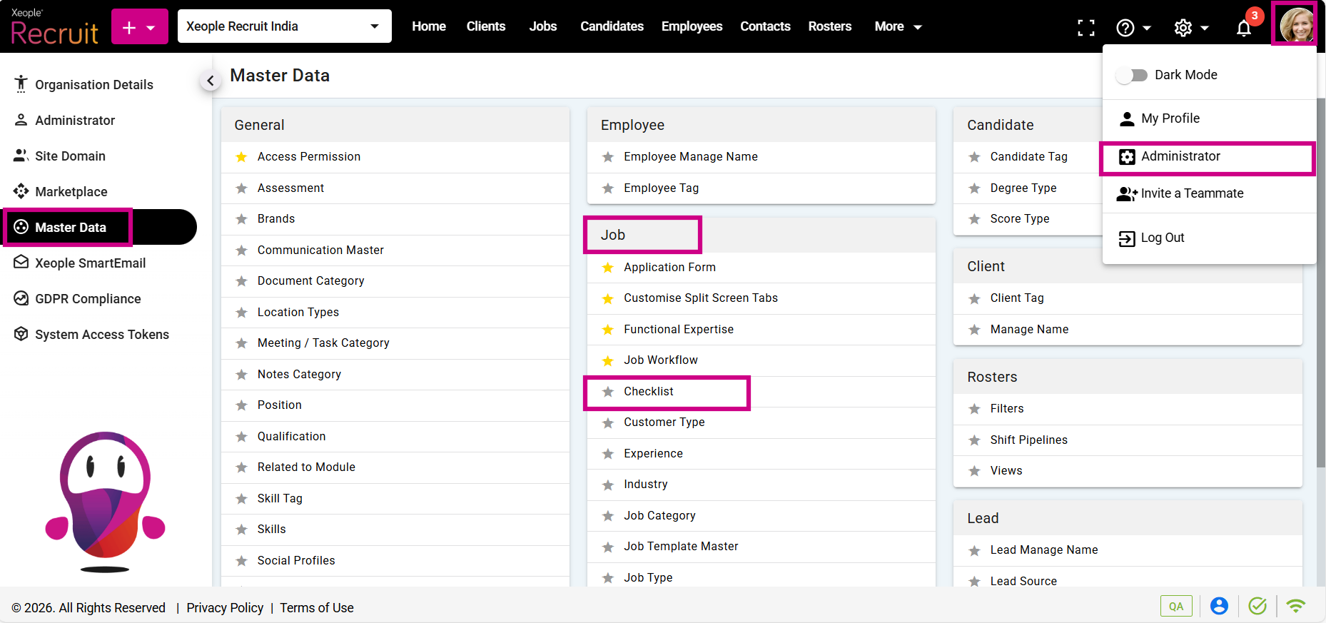 • Click on the Profile picture and select Administrator from the drop-down menu.