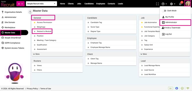 The Related To Module Master defines the modules (Job, Candidate, Client/Lead, Employee) that provide the context for Meetings and Tasks—such as whether an activity is related to a specific job, candidate, employee, or client/lead. It enables users to accurately link activities to the appropriate business entity, ensuring better organisation, traceability, and effective tracking and management.