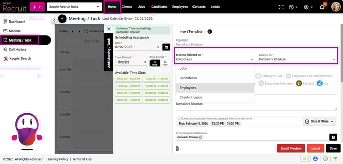 - You can select the newly created Related To Module from the Meeting Related To drop-down while scheduling a meeting. By default, the logged‑in user is selected in the Related To field, and the Meeting Related To field is set to Employee.