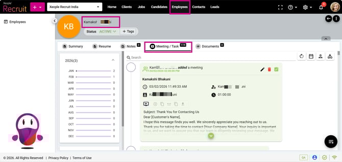 - Once the meeting is scheduled, it is saved under the Meeting/Task section of the selected module. For example, if the meeting is related to an employee and John is selected in the Related To field, the meeting is recorded under Employees > John > Employee Summary > Meeting/Task.