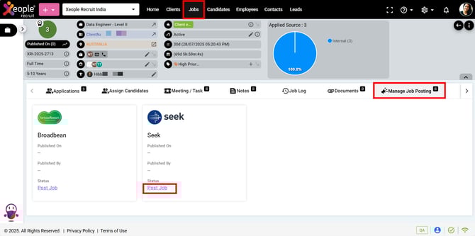 Similarly, upon clicking View Job from the three-dot button, you will be directed to the Job Summary page. From there, navigate to Manage Job Posting and select SEEK to post a job.